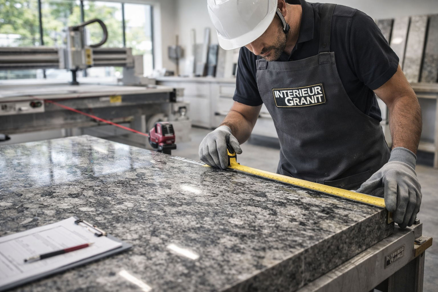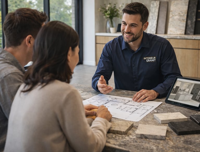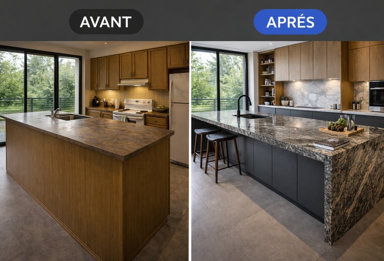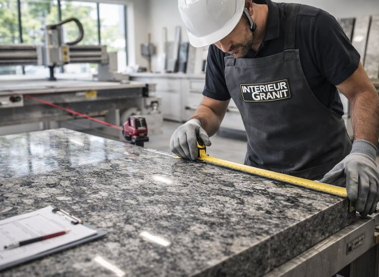 Fabrication et installation de plans de travail en granit, quartz, Dekton® et céramique. Découpe précise, finitions haut de gamme, intégration évier et crédence.