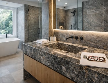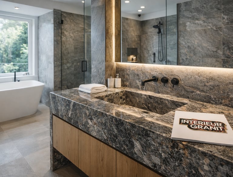 Plans de toilette, vasques intégrées, habillages muraux et receveurs sur-mesure en granit, marbre ou céramique.
