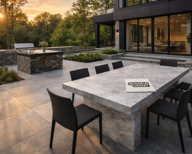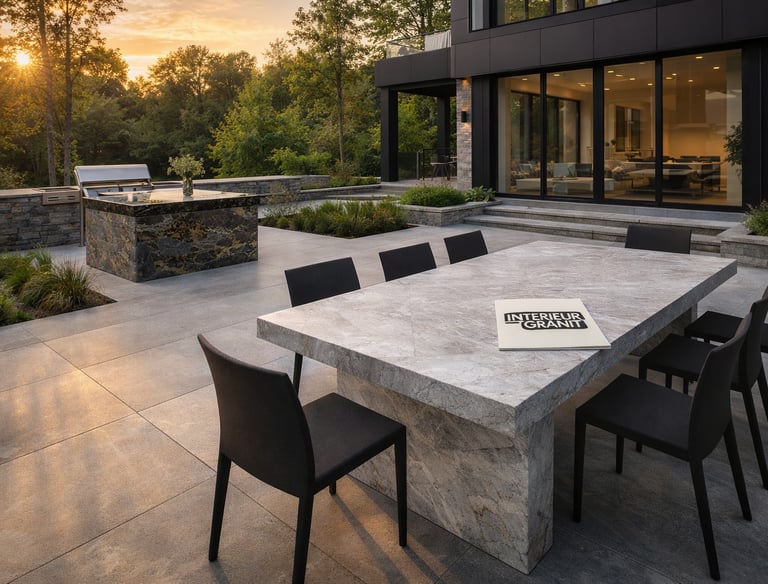 Murets, dallages, tables extérieures et éléments décoratifs en granit massif, résistants aux intempéries.