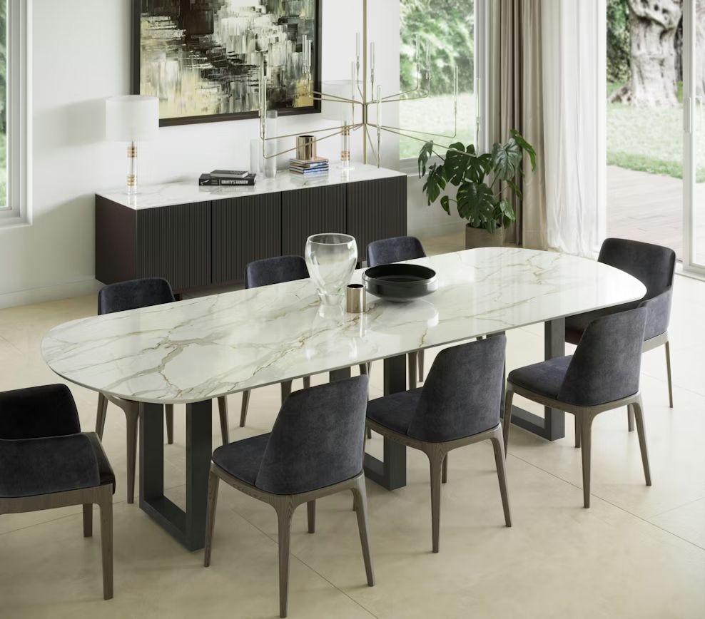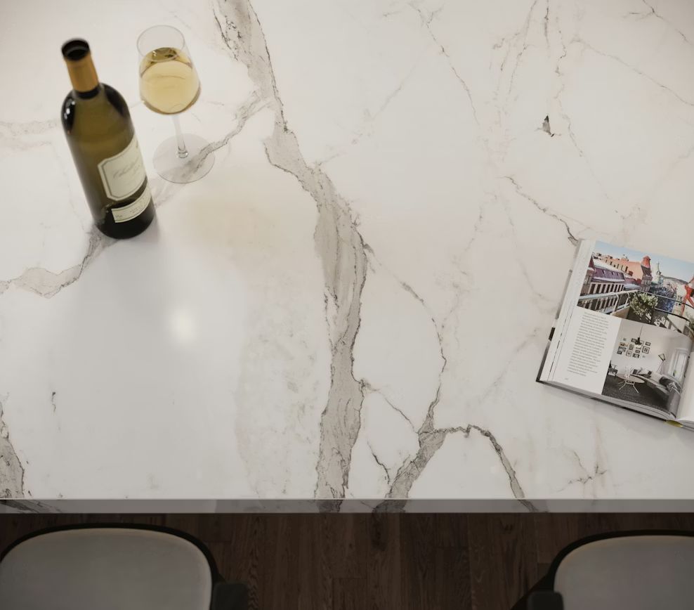 Daze recrée une structure de Calacatta forte avec des veines épaisses dans des dégradés de gris clair et foncé combinés à une touche subtile d’or