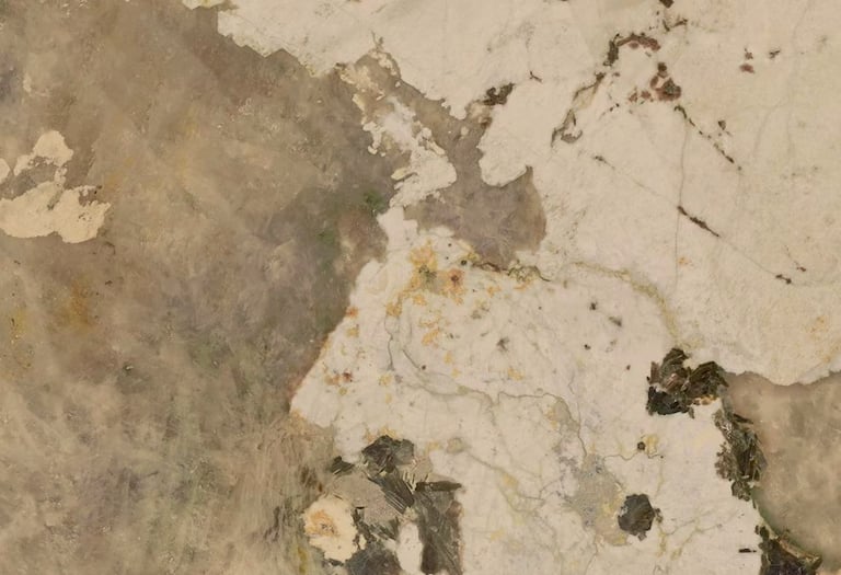 Couleur fluide avec un voile bleuté. L’arrière-plan révèle une combinaison de couleurs crème et grises, un mélange de tons qui se fondent entre les palettes blanches. De fines veines sinuent entre les oxydes et s’estompent pour devenir dorées rougeâtres