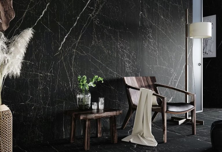 Inspiré par la pierre naturelle Port Laurent, le coloris épatant présente un fond marron foncé spectaculaire parcouru de veines dorées.