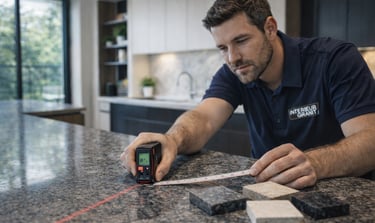 Un métreur spécialisé relève chaque dimension au laser pour un ajustement au millimètre.
